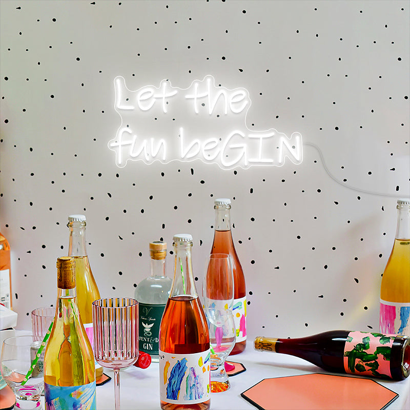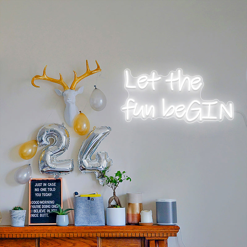 Kick off the good times with our Let The Fun beGIN Neon Sign. With playful typography and clever wordplay, this glowing piece brings a cheeky, upbeat energy to your space. Bright white neon lights pop, paired with the witty capitalization of “beGIN,” instantly grabbing attention and setting a festive mood. Perfect for gin lovers, home mixologists, party hosts, and anyone who enjoys a clever twist of humor in their décor.