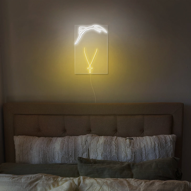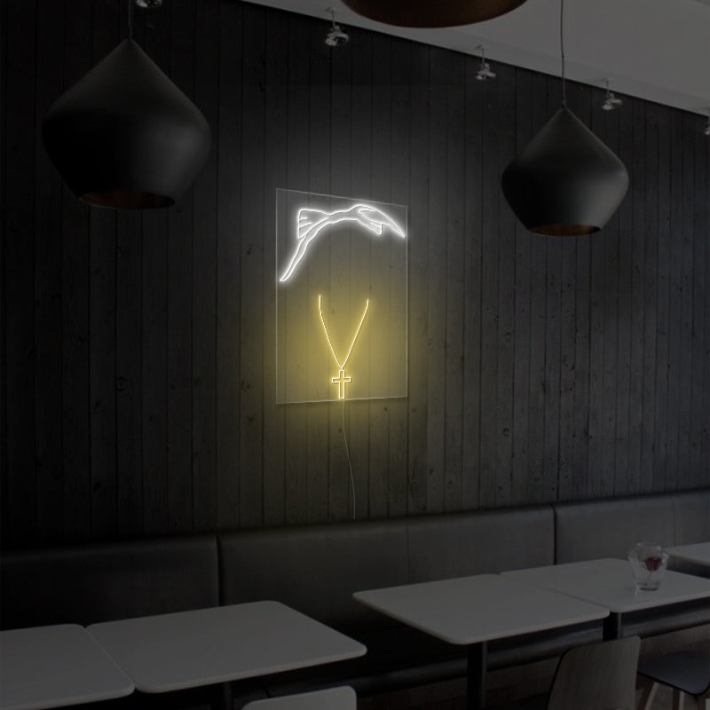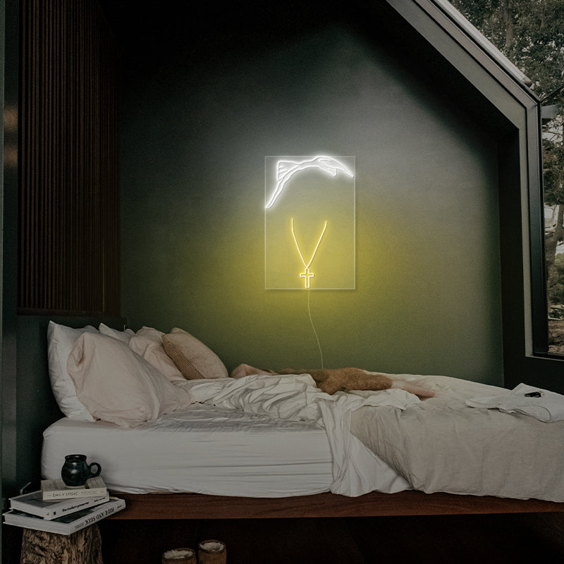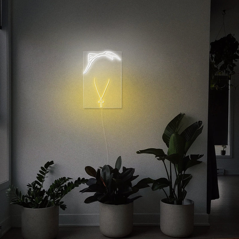 Crafted with durable LED lights, flexible silicone, and an acrylic backing, this sign ensures long-lasting shine and fascinating visual appeal. Featuring 2Pac’s iconic bandana silhouette in crisp white and a glowing gold cross, it creates a daring, edgy atmosphere filled with grit, grace, rebellion, and truth.