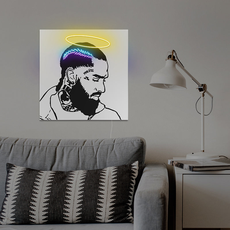 Crafted with durable LED lights, flexible silicone, and a sturdy acrylic backing, this neon sign is built to last and captivate. The bold outline of Nipsey, with radiant blue and purple braids, crowned with a glowing yellow halo, creates a powerful, inspiring atmosphere that keeps you grounded and motivated to stay prolific.