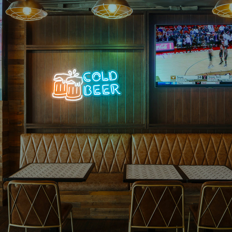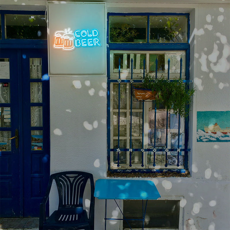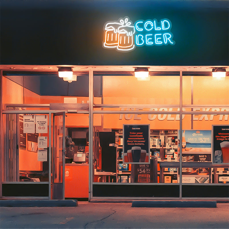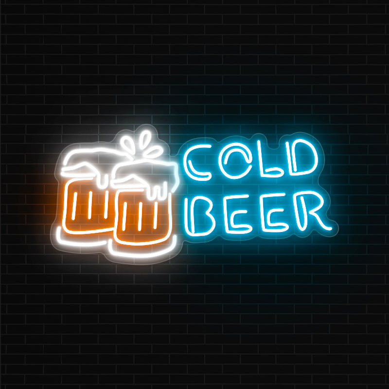 Bring a cool pop of refreshment to your space with our Cold Beer Mug Neon Light Sign. Featuring two clinking beer mugs with playful splash details, this design adds a laid-back, celebratory vibe to any setting. Vibrant orange, crisp white, and ice-blue neon tones instantly create a cheerful, welcoming glow. Ideal for bar owners, beer enthusiasts, or anyone looking to energize their space with fun and character.