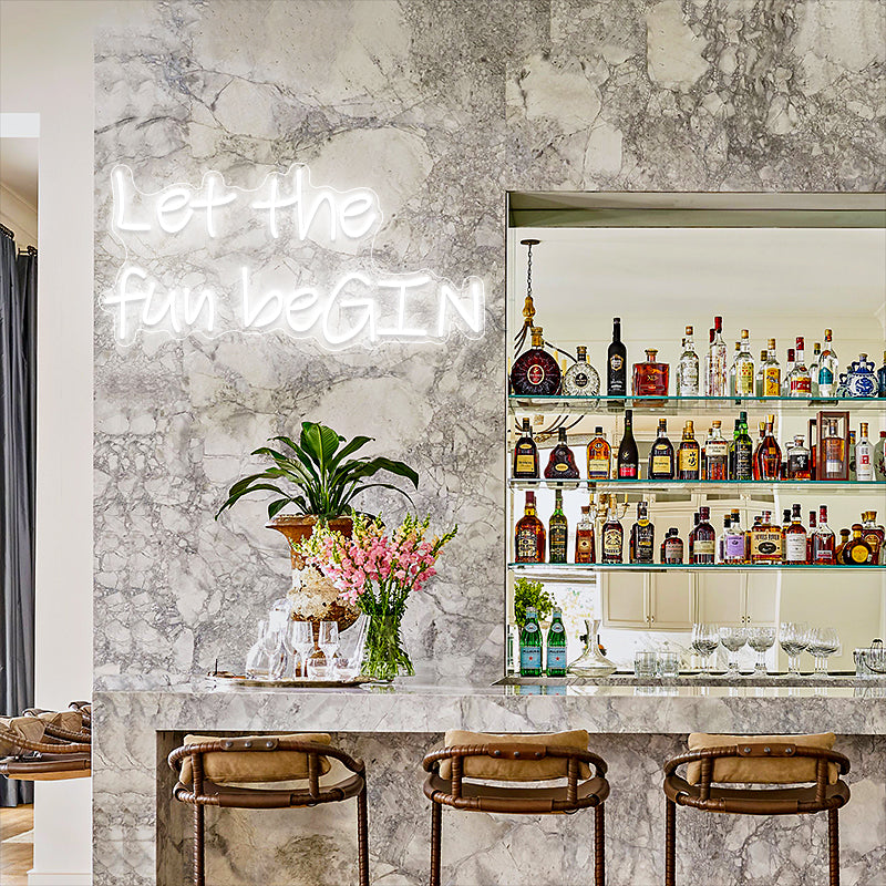 Let The Fun beGIN Neon Sign, with its crisp glow and pun-loving spirit, creates a playful ambiance, making it a perfect addition to cocktail bars, home bars, drink stations, lounges, and party rooms.